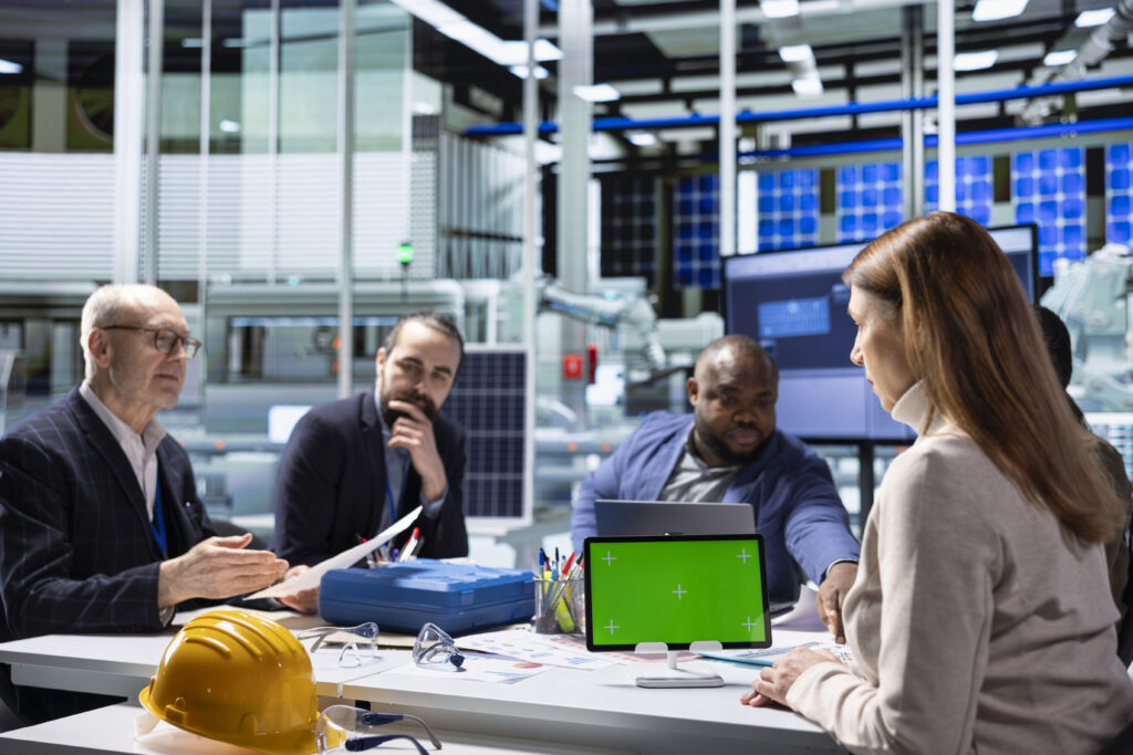 Businesspeople collaborate on strategic investments in solar energy. Photovoltaics factory management team and investor standing together in facility with manufacturing equipment after finishing deal